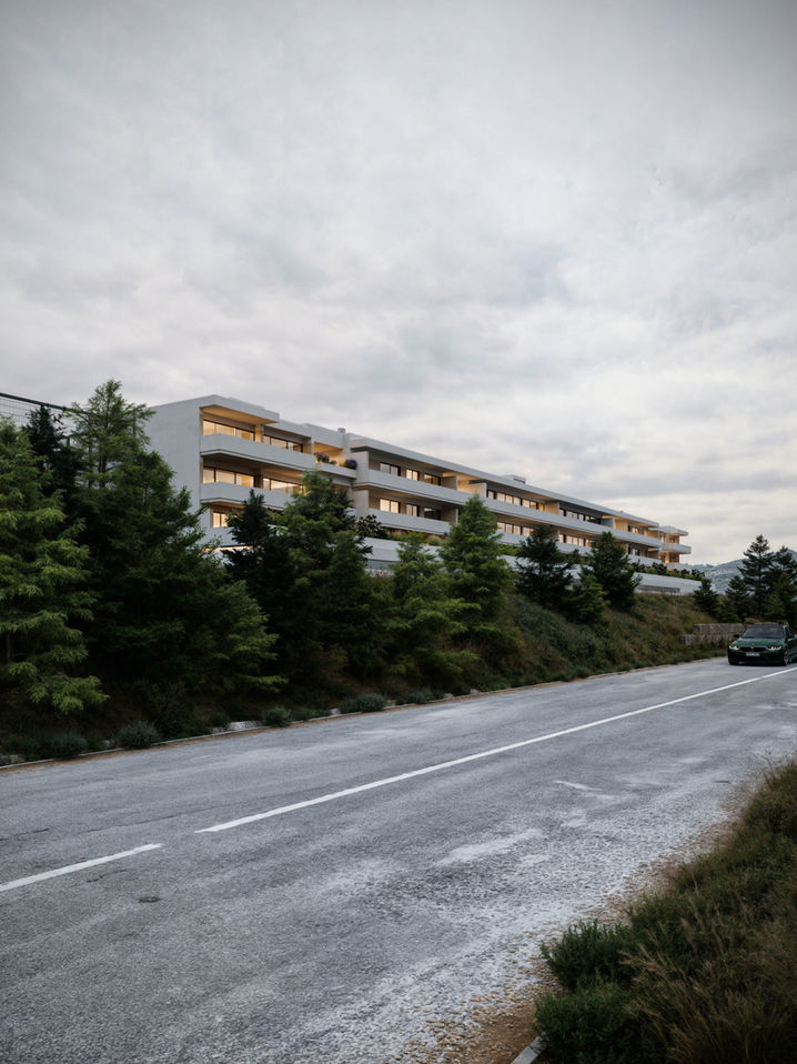 Contrapondo-se, a fachada virada a sul, revela-se como uma expressão mais ousada e dinâmica. Aqui, a distribuição estratégica de vãos panorâmicos, varandas e terraços expressivos, promovem uma exposição solar privilegiada e convidam à íntima conexão com as espetaculares vistas sobre as serras de Arruda dos Vinhos.
